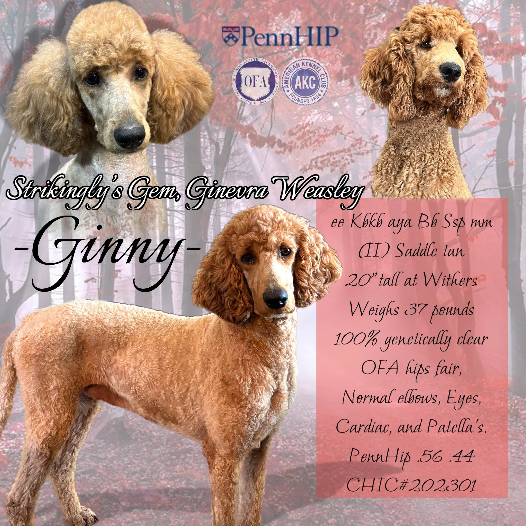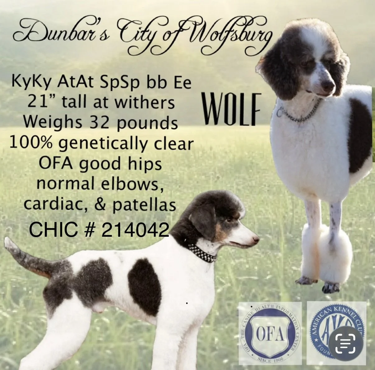 All our parents are AKC registered and 100% genetically cleared through Canine Health Check, which screens for over 325 health conditions.