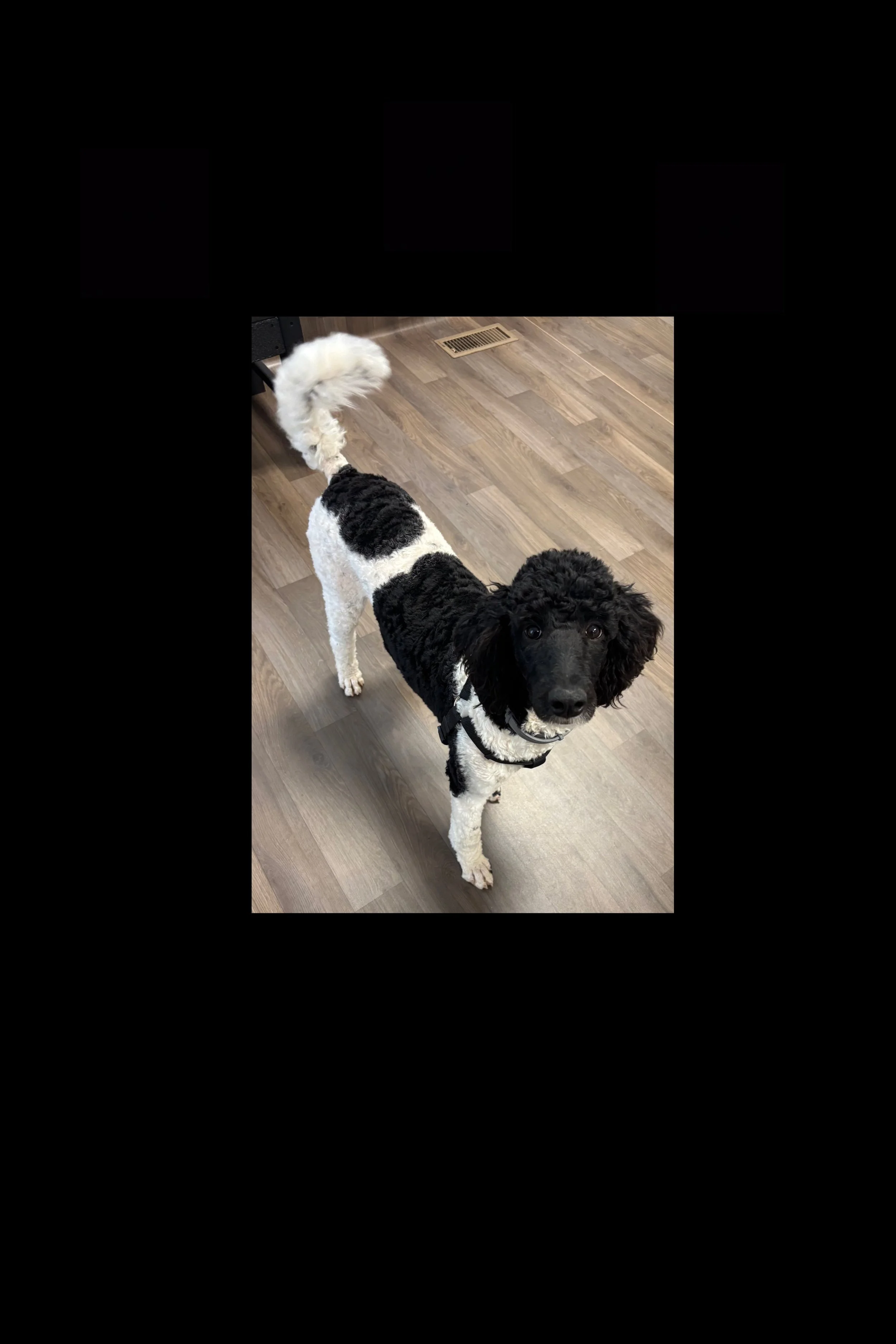 Sprout is our first third generation female we produced and retained for our program. She is an athletic and confident AKC Black/White Parti Standard Poodle. Sprout is the daughter of Magic and Sly, as part of The Snacks Litter and is an amazing addition to our program.